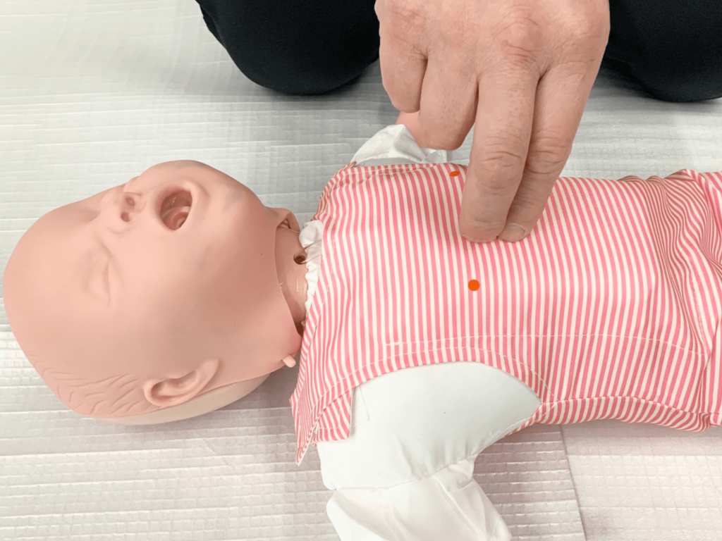 小児の人形で心配蘇生の練習をしている
